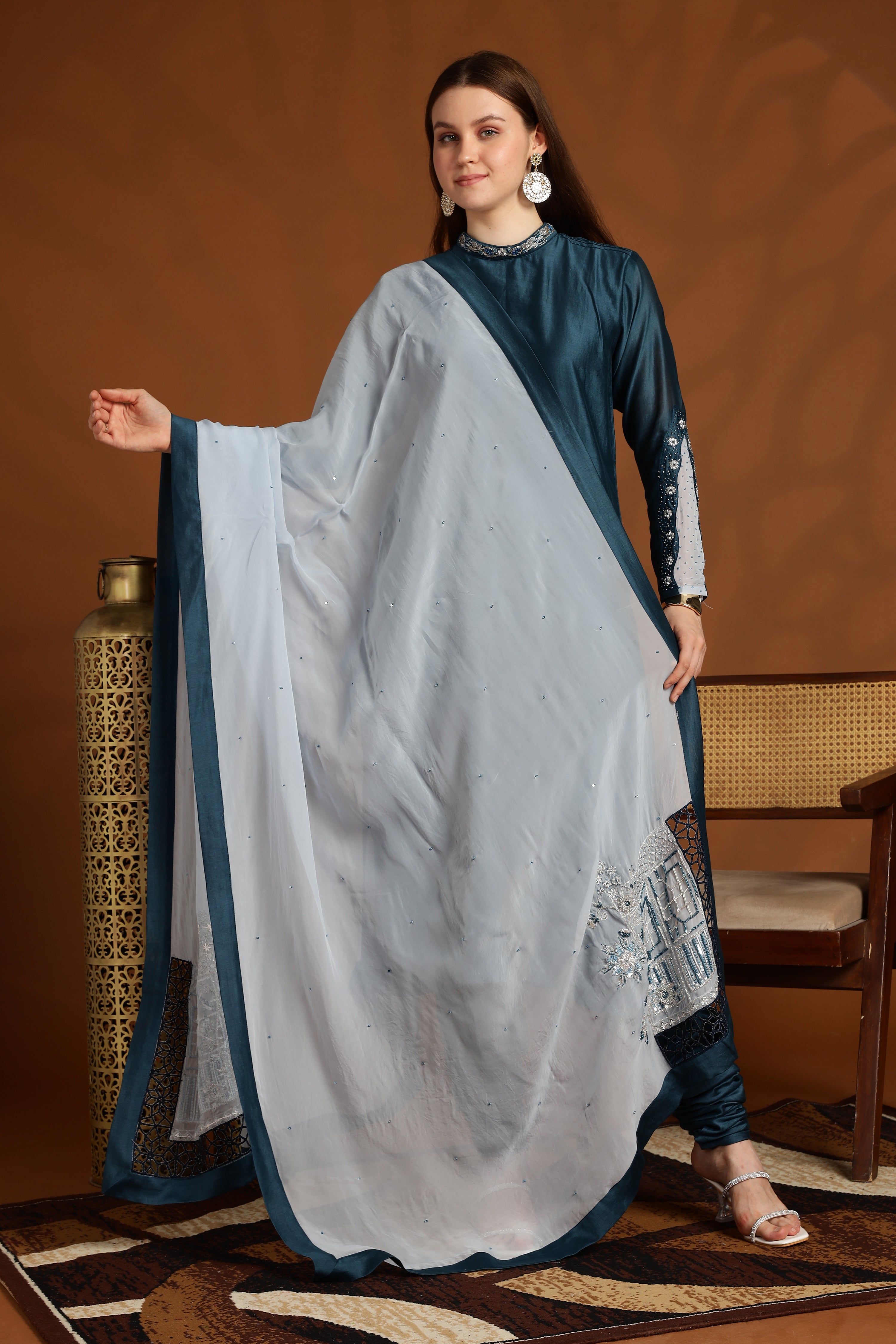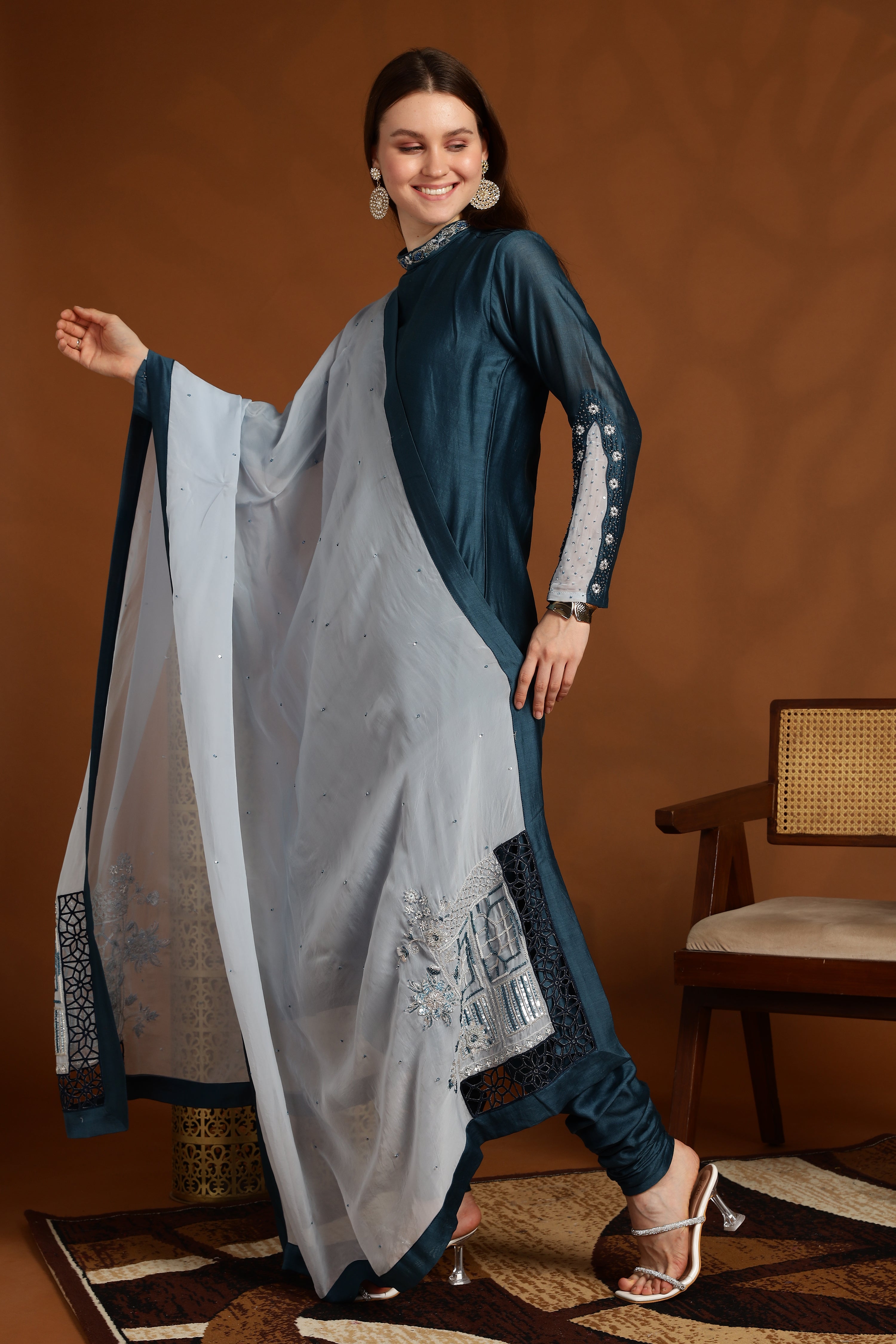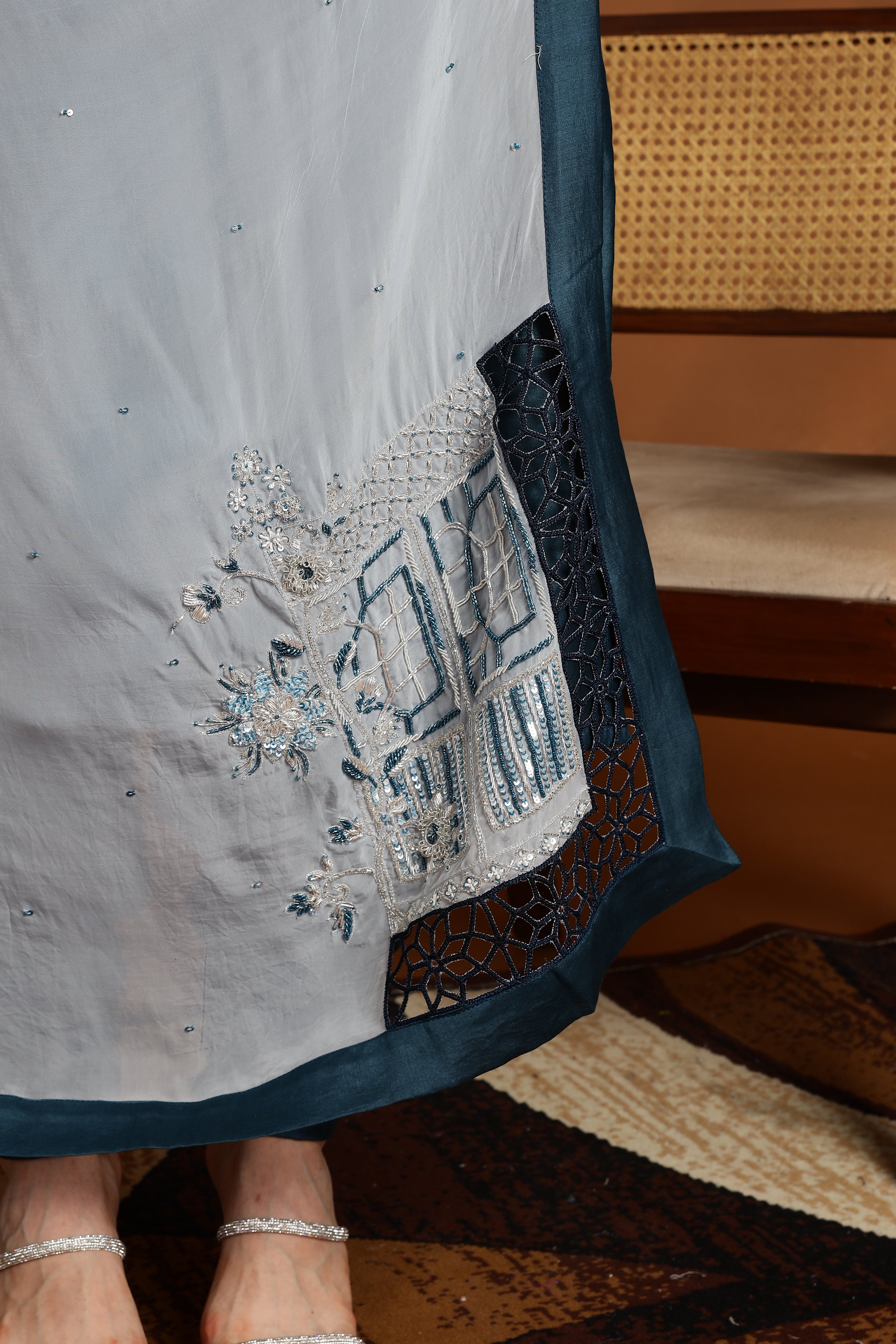 Jharoka is a serene blue chanderi suit featuring a closed neckline, beautifully adorned with intricate handwork. The sleeves feature organza patches embroidered with delicate detailing. Paired with a churidaar, the look is completed with an organza dupatta adorned with hand embroidered window motifs and fine cutwork, inspired by Kashmiri architecture. Part of the Nazar-e-Shehr collection, Jharoka is a perfect blend of tradition and elegance.