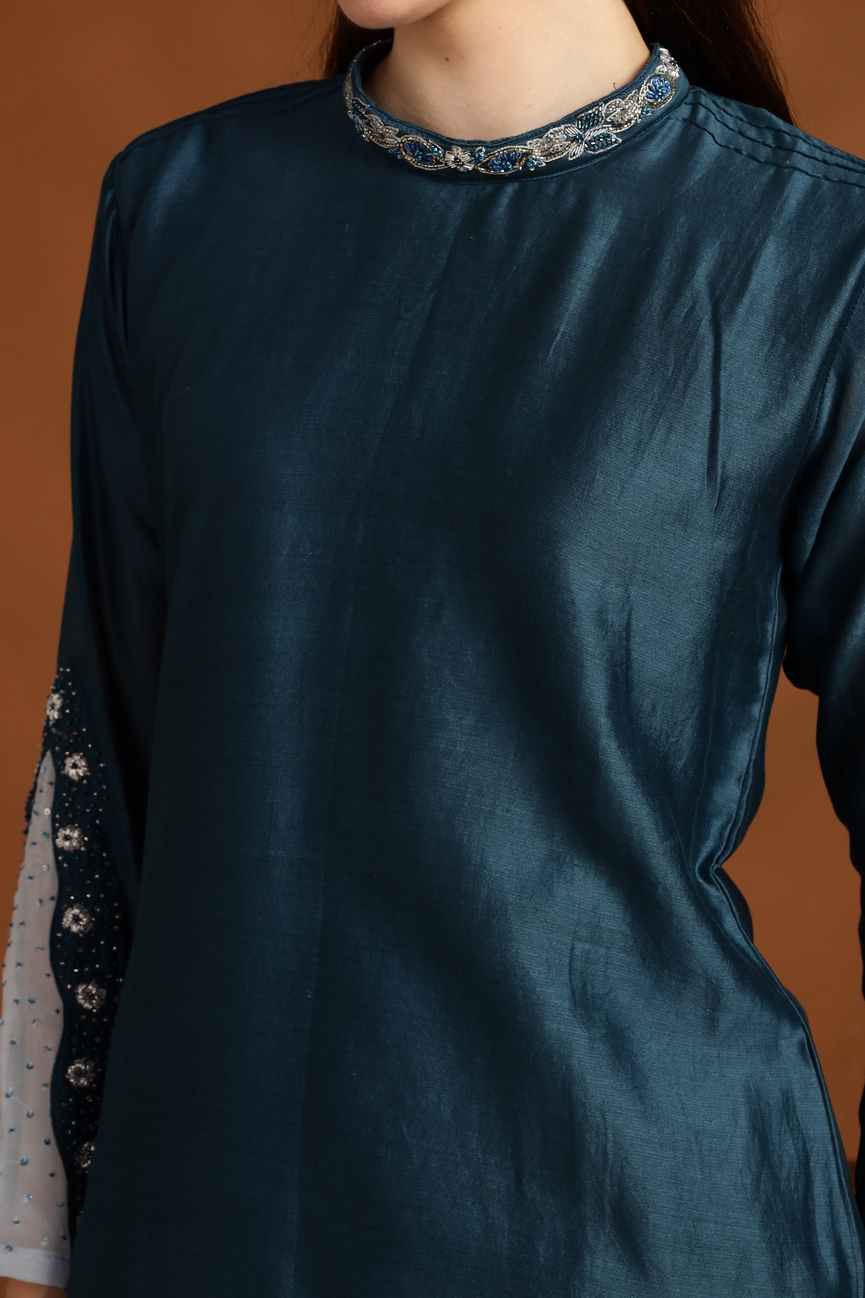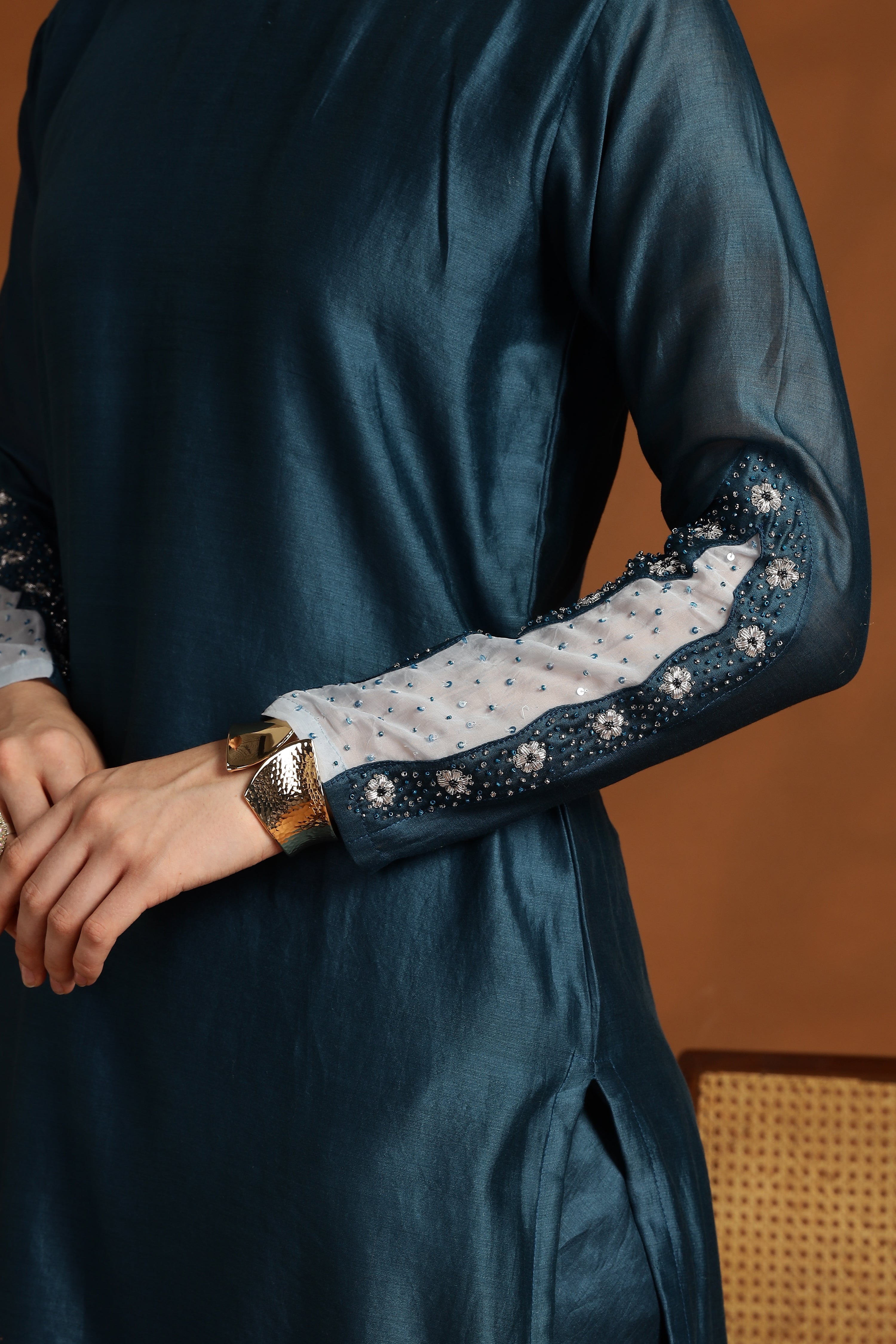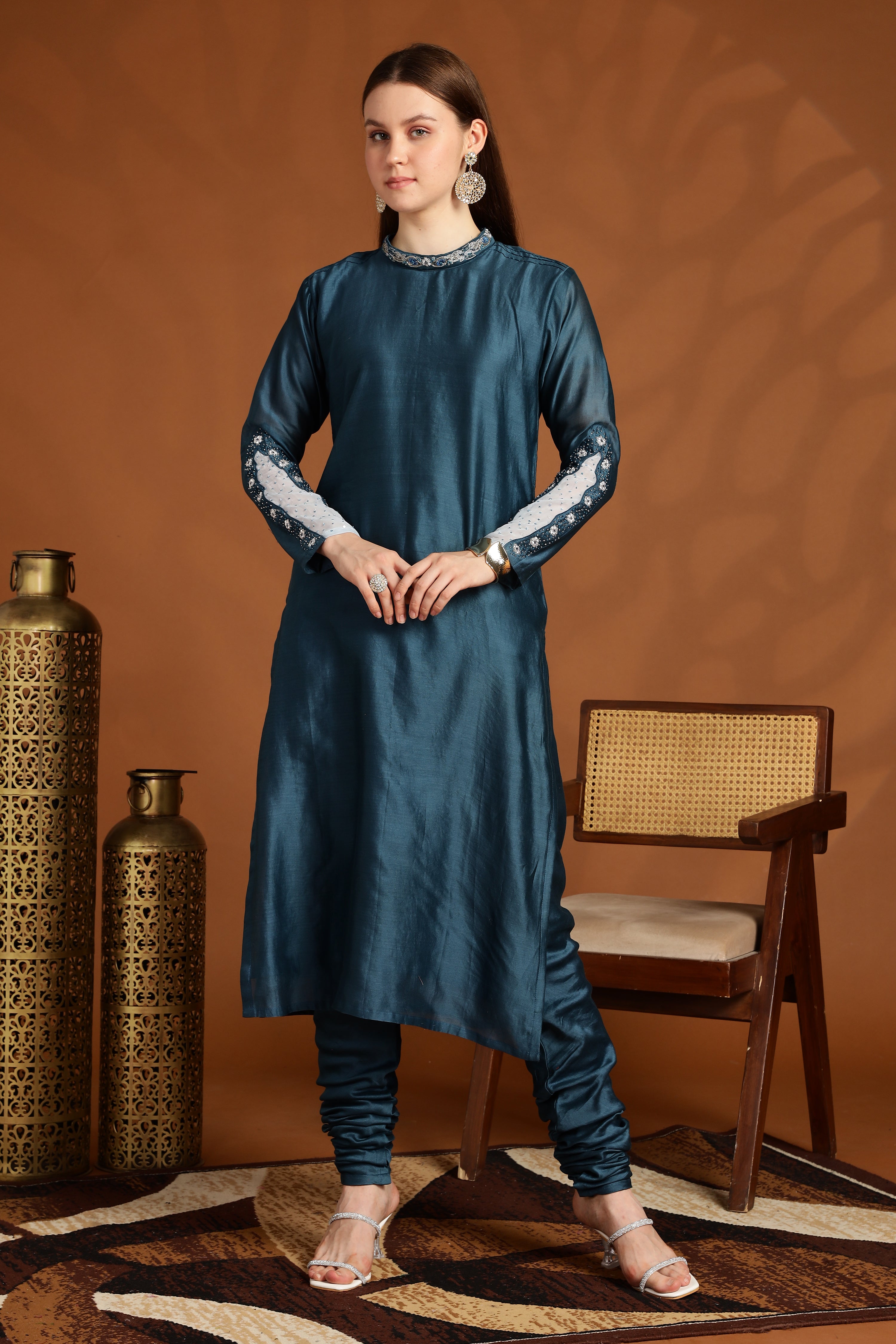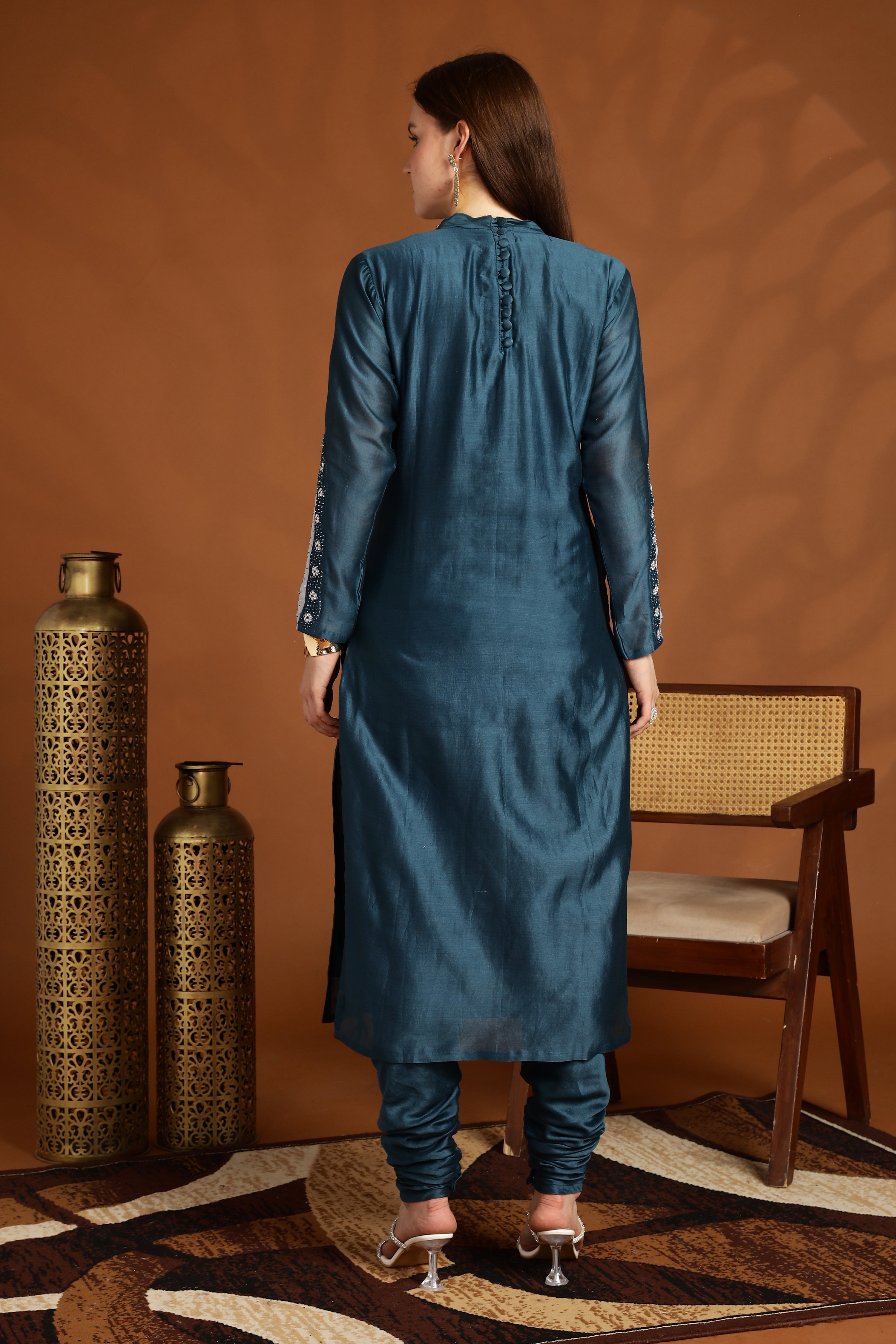 Jharoka is a serene blue chanderi suit featuring a closed neckline, beautifully adorned with intricate handwork. The sleeves feature organza patches embroidered with delicate detailing. Paired with a churidaar, the look is completed with an organza dupatta adorned with hand embroidered window motifs and fine cutwork, inspired by Kashmiri architecture. Part of the Nazar-e-Shehr collection, Jharoka is a perfect blend of tradition and elegance.