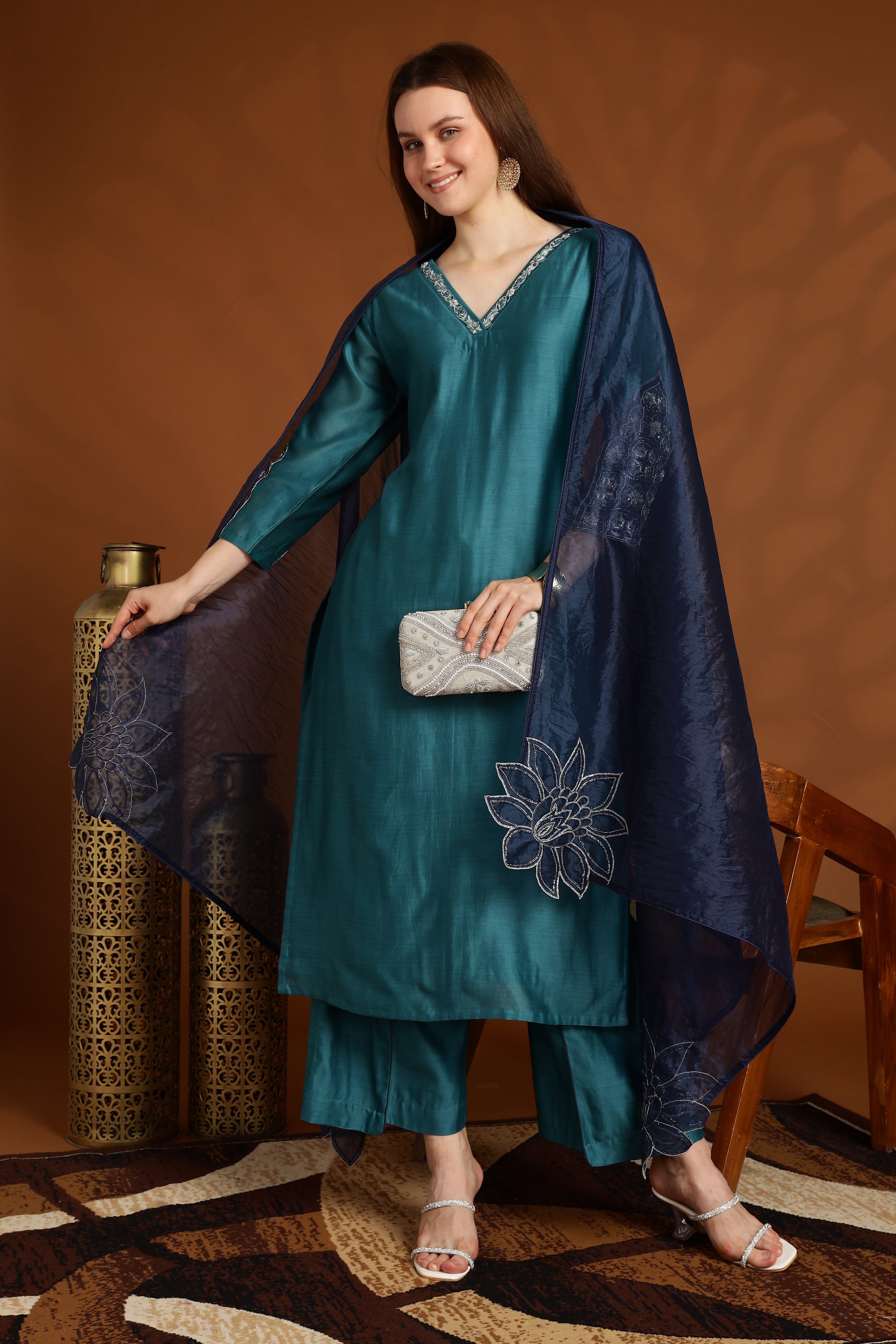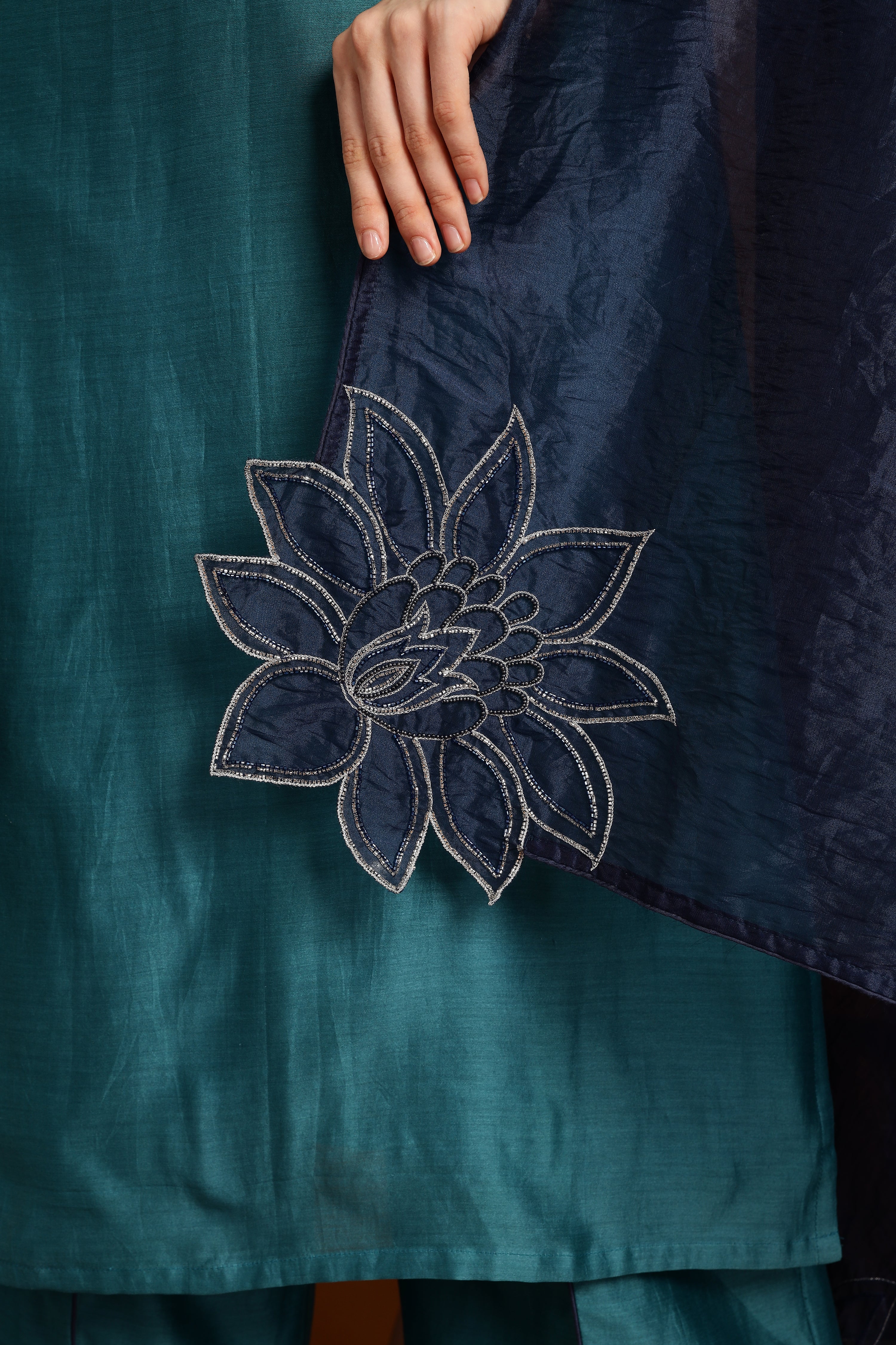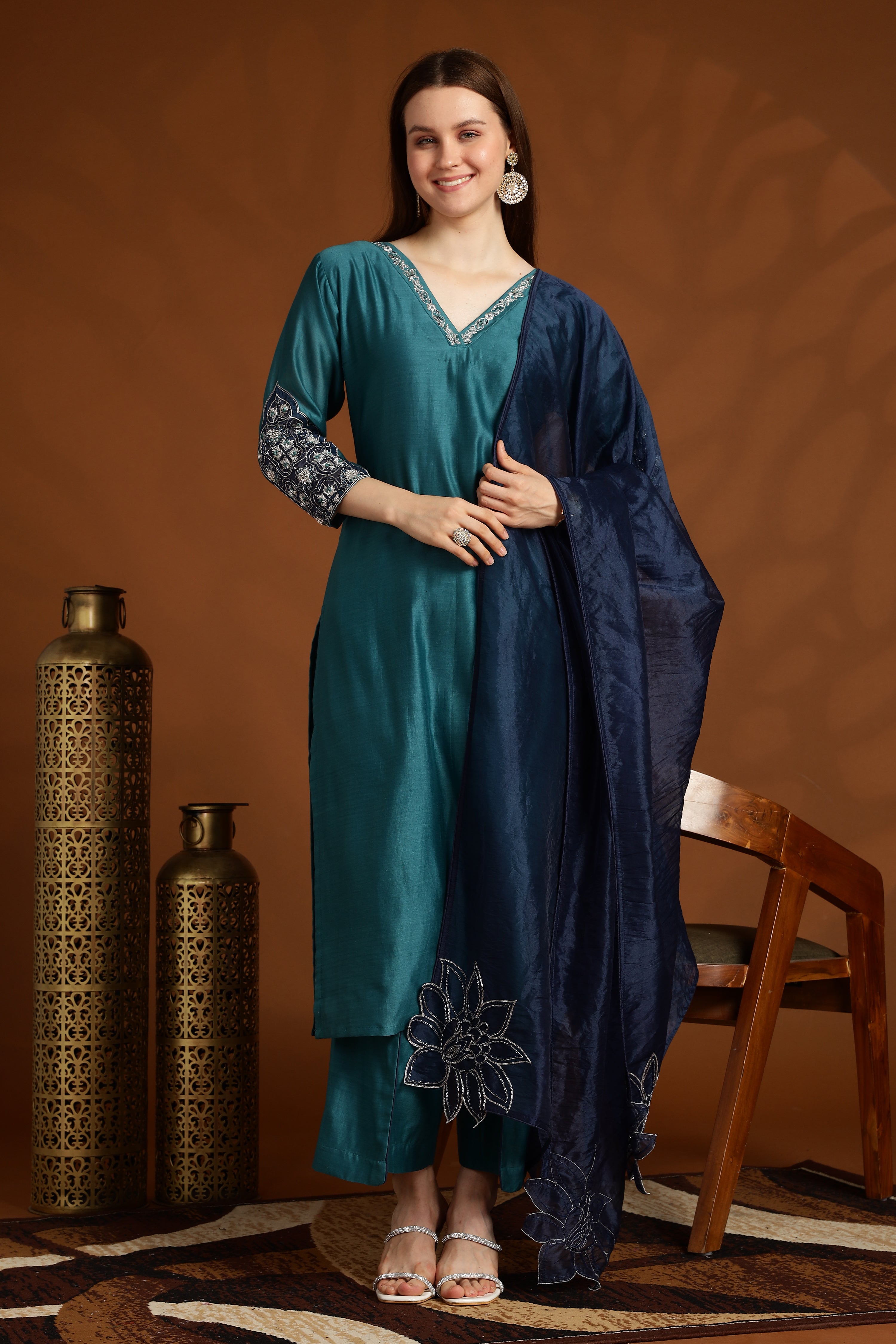 Mehraab is a teal green chanderi suit with a V-shaped neckline and delicate hand embroidery. The sleeves feature intricate window-inspired embroidery, adding a distinctive touch. It is paired with a midnight blue organza dupatta, adorned with floral handwork motifs on all four corners. Part of the Nazar-e-Shehr collection, Mehraab blends Kashmiri tradition with timeless elegance.
