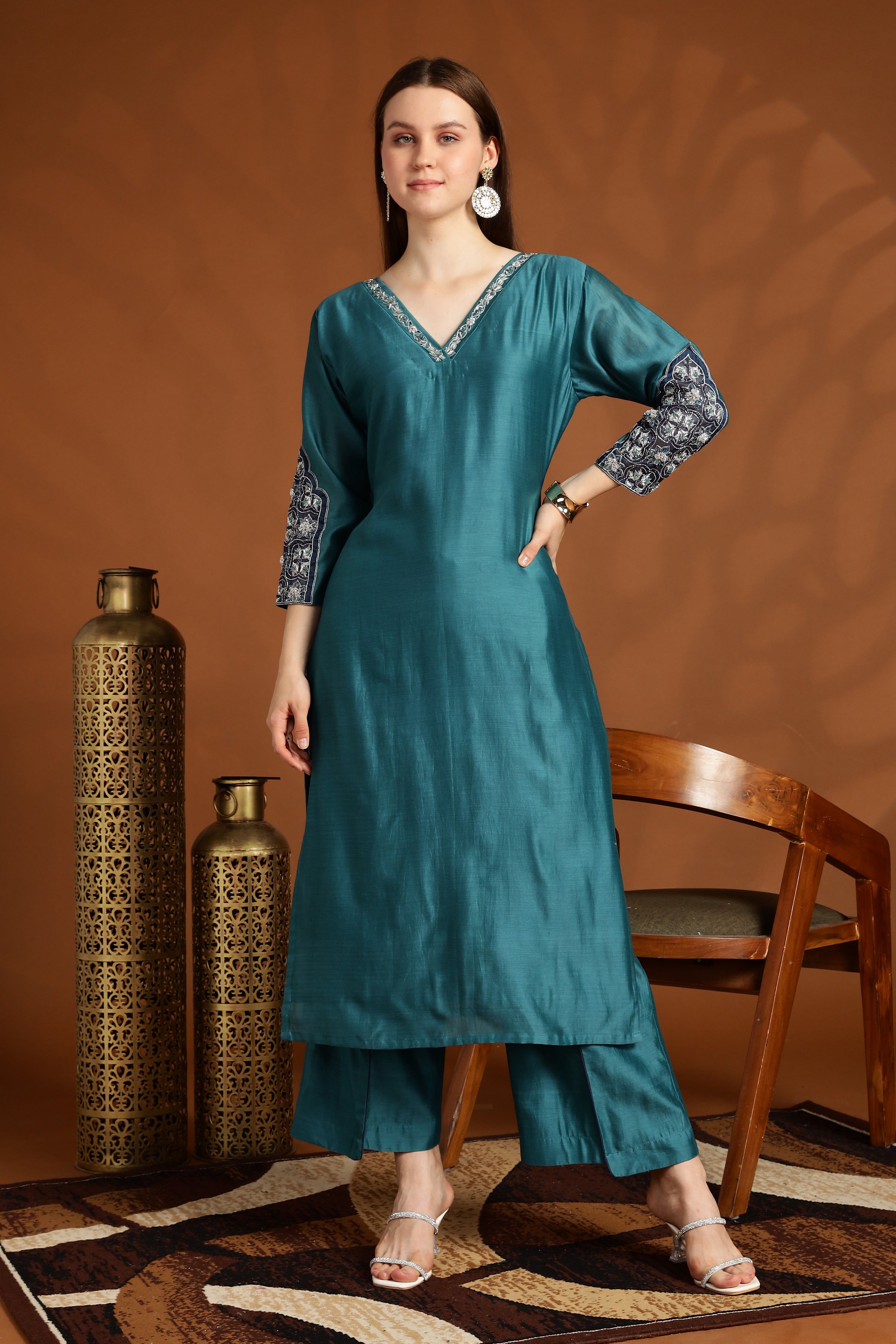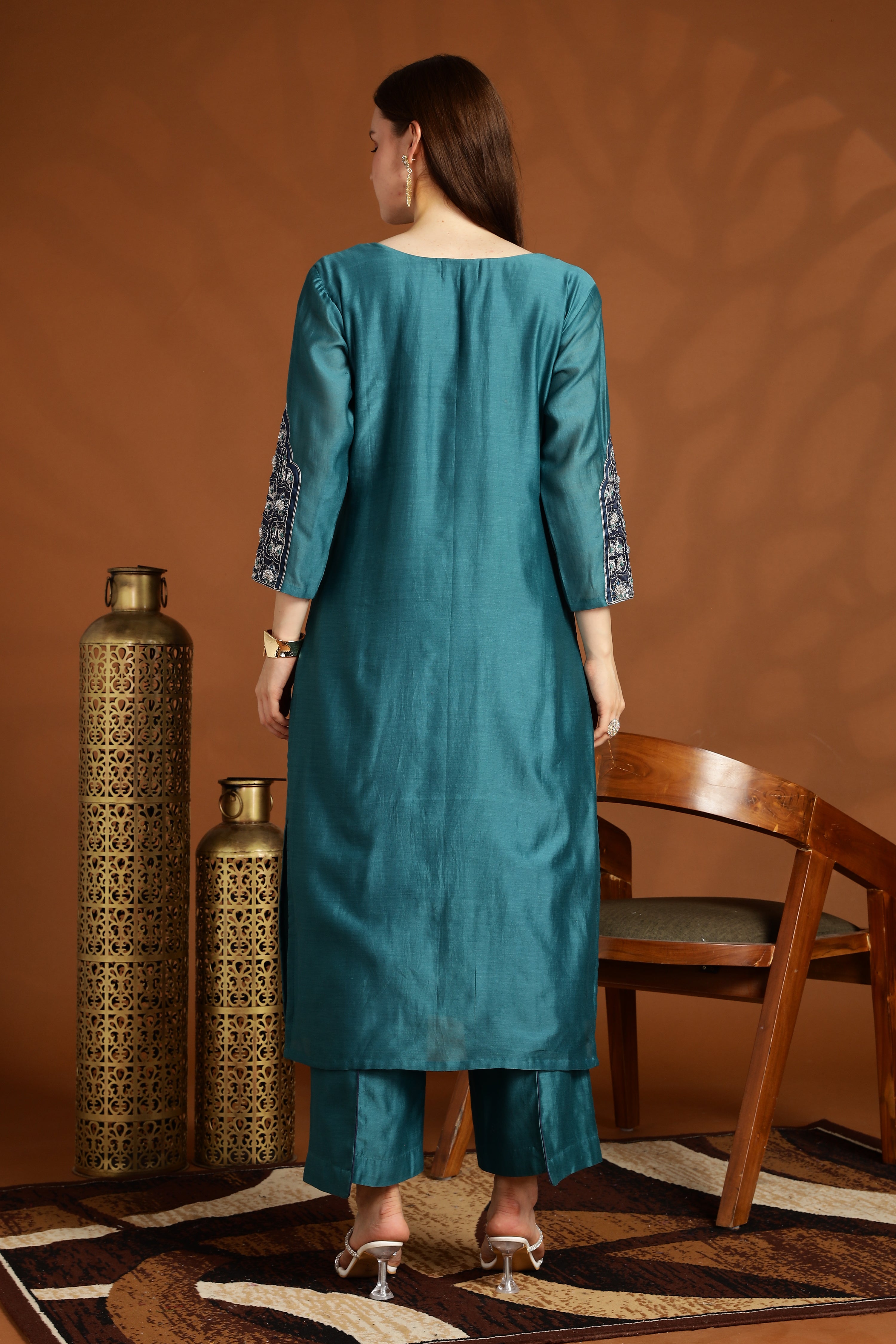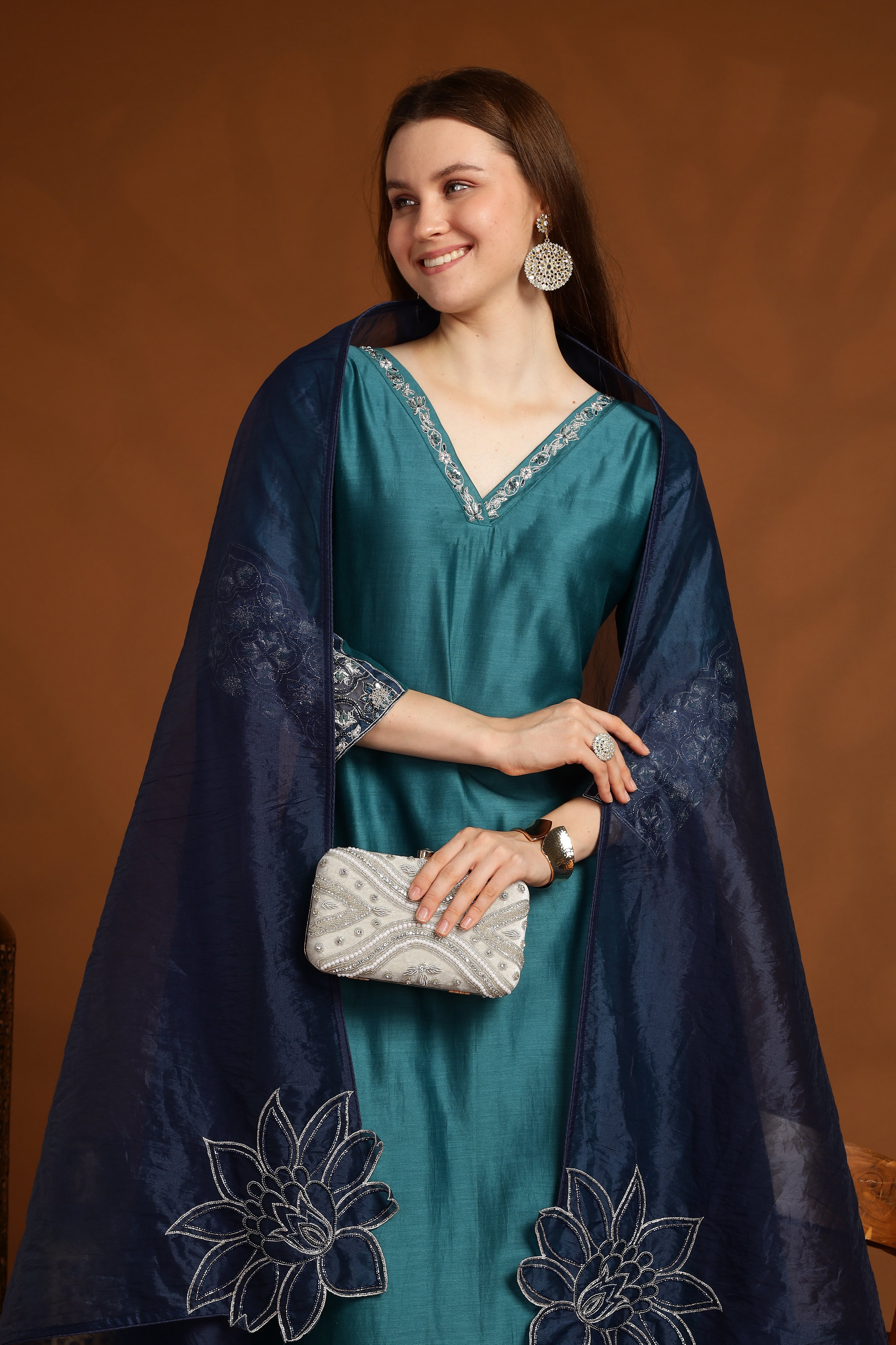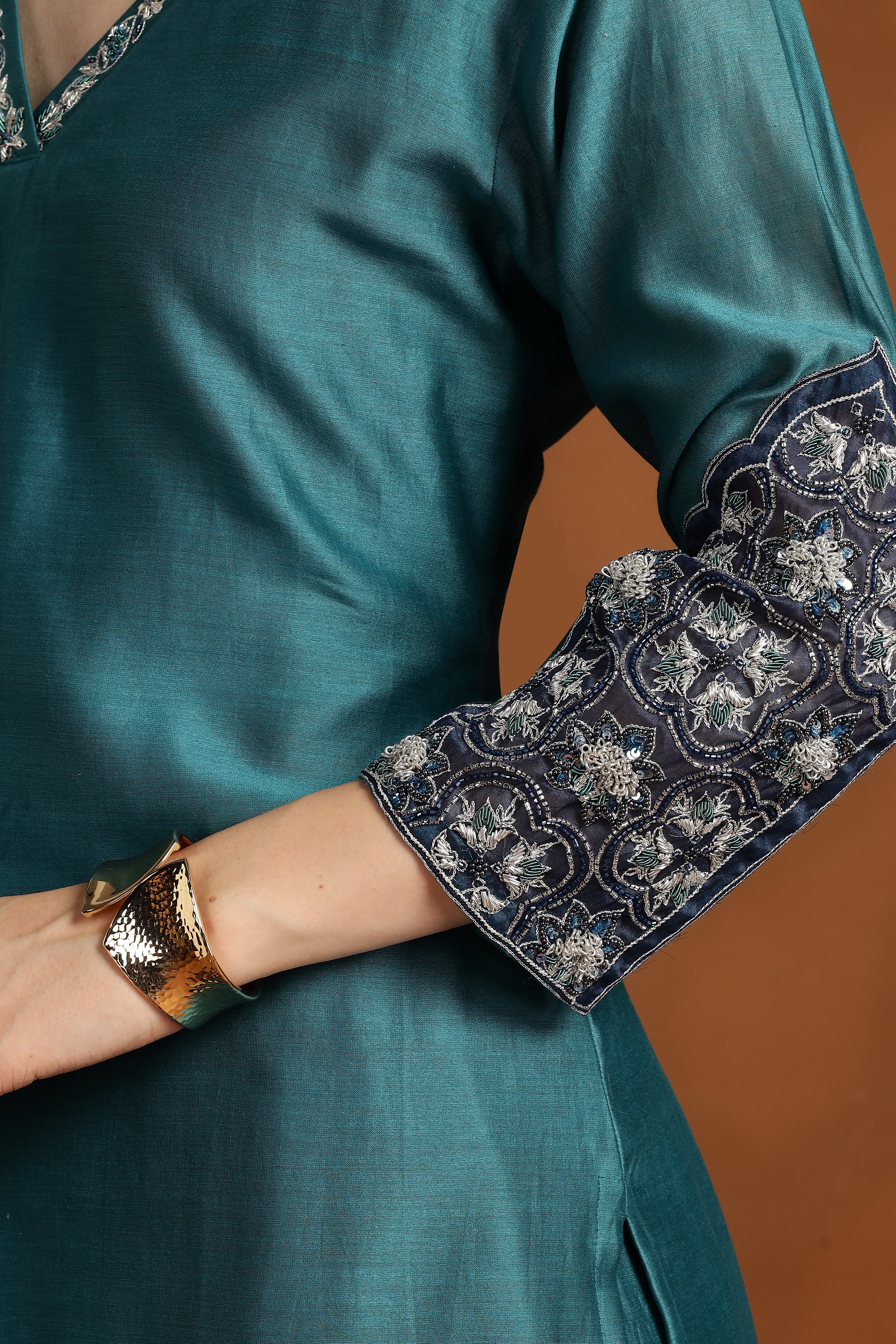 Mehraab is a teal green chanderi suit with a V-shaped neckline and delicate hand embroidery. The sleeves feature intricate window-inspired embroidery, adding a distinctive touch. It is paired with a midnight blue organza dupatta, adorned with floral handwork motifs on all four corners. Part of the Nazar-e-Shehr collection, Mehraab blends Kashmiri tradition with timeless elegance.